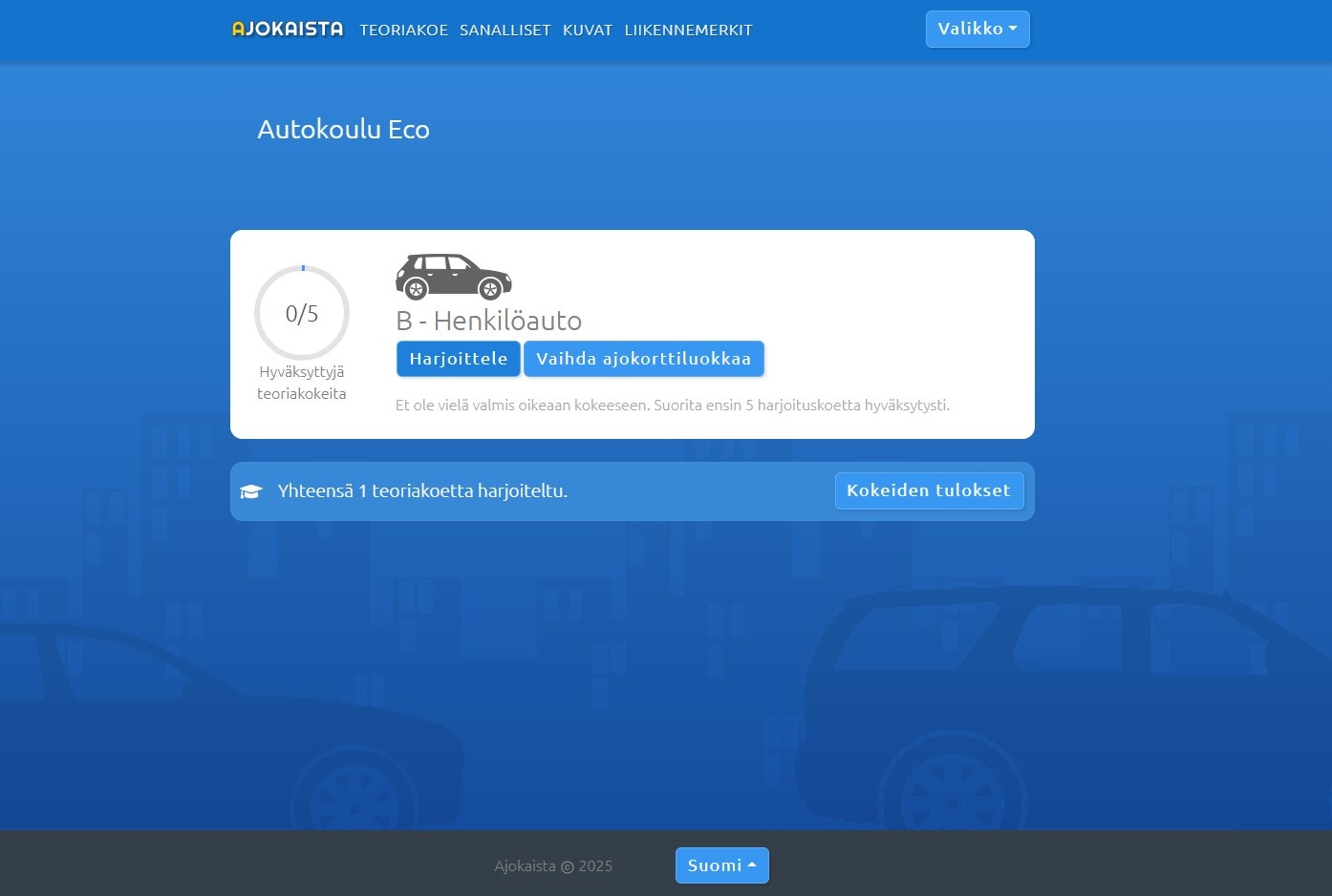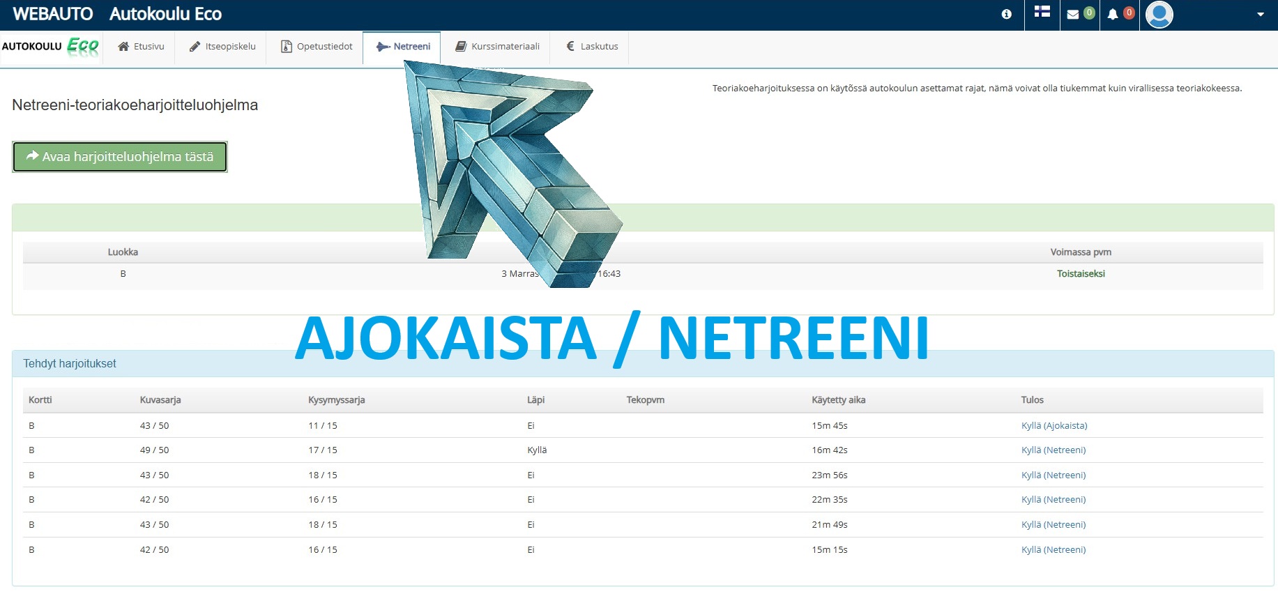 Itsenäinen opiskelu on tärkeä osa ajamisen oppimista. Täältä pääset netin opiskeluohjelmiin, virtuaaliteoriatunneille ja harjoituksiin. Kun aloitat autokoulun, saat autokoululta käyttäjätunnuksen Webautoon (kuljettajaopetus.fi/autokoulueco). Löydät kaikki harjoittelumateriaalit ja opiskelutiedot ja laskut WebAutosta. DL e-Oppikirja on vain Autokoulu Econ oppilailla käytössä oleva oppikirja. Ajokaista on teoriakokeen harjoitteluohjelma (aikaisemmin netreeni). Virtuaaliteoriatunneille pääset WebAuton pääsivulta.