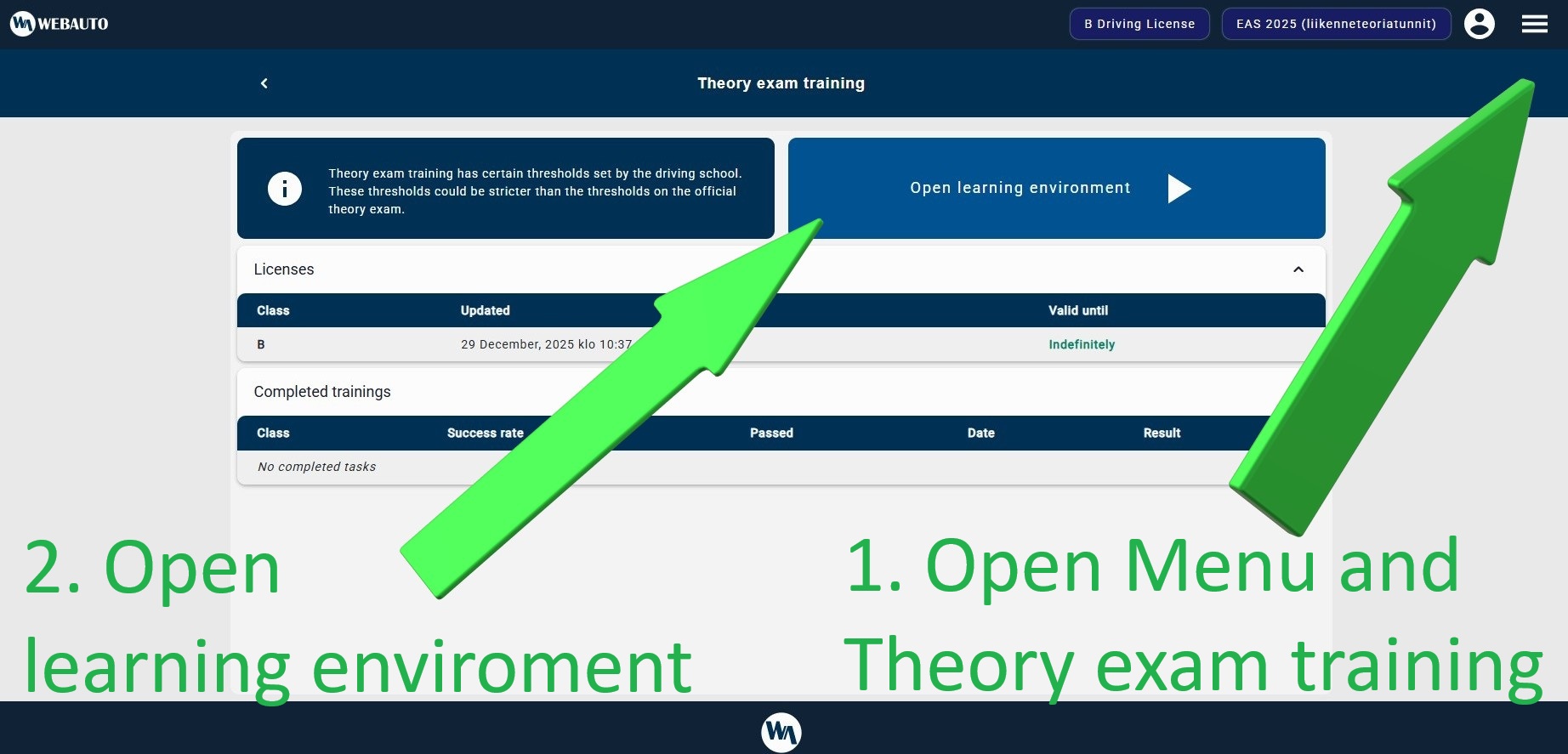 Independent study is an important part of learning to drive. Here you can access online study programs, virtual theory classes and exercises. When you start driving school, you will receive WebAuto username from the driving school (kuljettajaopetus.fi/autokoulueco). You can find all training materials, study information and invoices on WebAuto. DL e-Book is a book for use only by Autokoulu Eco students. Ajokaista is a theory test practice program (earlier netreeni). You can access virtual theory classes from the WebAuto main page.